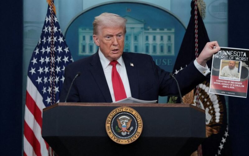 En el primer aniversario desde su retorno al poder, Donald Trump ha comparecido este martes, por sorpresa y una hora tarde, en la abarrotada sala de prensa de la Casa Blanca. Llevaba consigo una pila de papeles con los “éxitos” de su mandato, así como fotografías policiales de los “viciosos asesinos y narcotraficantes” que, según ha afirmado, se encuentran entre los 10.000 detenidos por sus agentes migratorios en Minnesota. “¿Queréis vivir con esta gente?”, ha preguntado, y se ha pasado cinco minutos enseñando las imágenes y leyendo sus delitos. “Fueron admitidos por el dormilón Joe Biden, el corrupto Joe Biden, como prefiráis llamarlo”, ha dicho, repitiendo el mensaje principal de su campaña electoral: “Llegaron de prisiones, de instituciones mentales, y esa es la gente a la que (los demócratas) están tratando de proteger”.